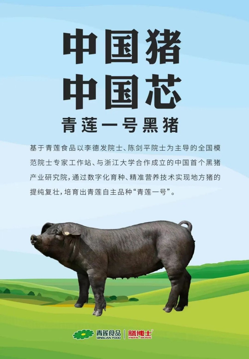 而今,膳博士在青蓮生豬產業研究院、青蓮·中國黑豬產業研究院,以及以李德發院士領銜的全國模范院士專家工作站背書加持下,通過數字育種自主開發豬“芯片”,已牢牢掌握黑豬美味基因密碼,為中國本土豬的保種繁育、傳承創新貢獻力量!